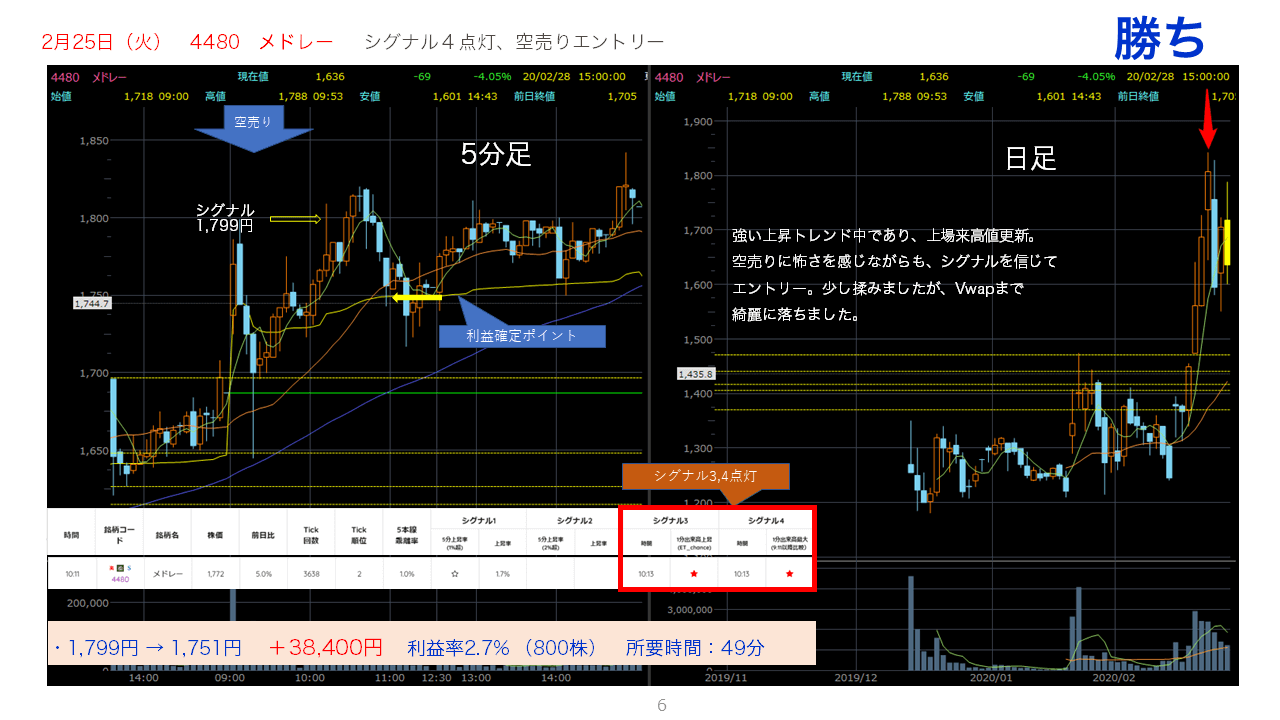 マザーズ1%スキャル「2020年2月25日のトレード結果」メドレー(4480)